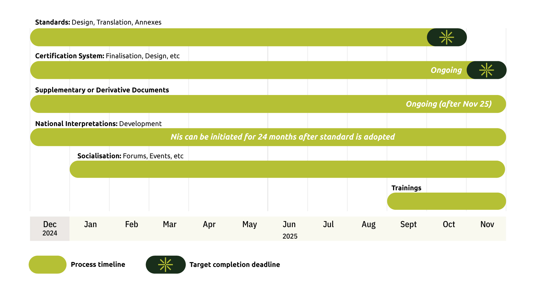 As part of the RSPO Standards Review 2022-2024, the RSPO Certification Systems for the Principles and Criteria (P&C) and RSPO Independent Smallholder (ISH) Standard were revised in parallel with the RSPO Standards. Finalisation of the revised Certification Systems document is currently ongoing. The timeline below outlines the expected schedule and target deadlines for completion/endorsement. Following endorsement of the revised RSPO Certification Systems for the P&C and RSPO ISH Standard, there shall be a formal transition period to support change management and implementation of new/amended requirements of the revised document by accredited Certification Bodies. This transition period shall be aligned with that of the revised 2024 RSPO Standards, to be effective on the same date (13 November 2025).